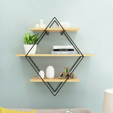 Metal Wood Round Rhombus Design Grid Wall Shelf Industrial